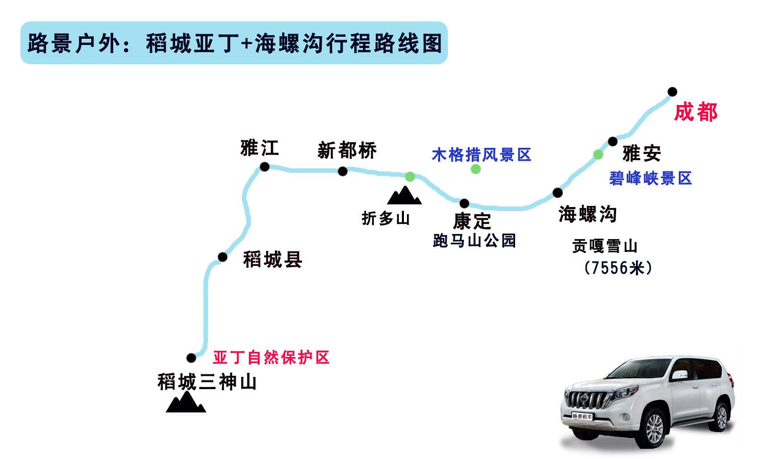 從成都租車自駕走稻城亞丁我們一般都推薦越野車型,一般越野車有三菱獵豹,三菱帕杰羅V73,三菱勁暢,豐田普拉多2.7,豐田普拉多4.0,豐田漢蘭達,豐田陸地巡洋艦,豐田陸巡100型,途觀,牧馬人等越野車!